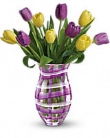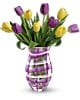Put spring in their spirit with 10 brilliant yellow and purple tulips in a sparkling glass vase decorated with a hand-painted plaid design. Simple, stylish, and a sheer delight - now and forever.